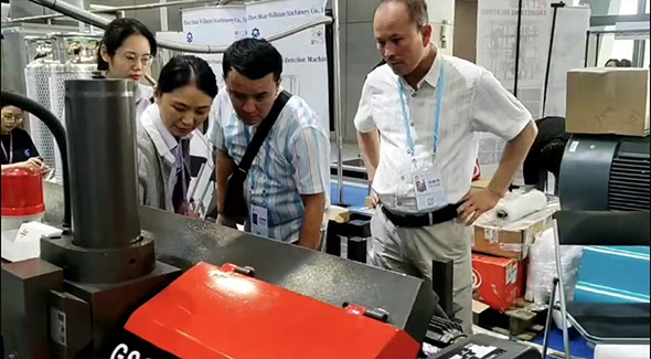 在本次展会上,金锋锯业展出了公司的“拳头产品”—GS260数控带锯床。此设备采用PLC控制系统,可设置一组或几组数据连续切割,精度高、切割快。彩色触摸屏设置,新手可快速上手。此锯床一经展出,便吸引不少中外客户前来参观咨询,市场部热情细致的讲解引得连连赞叹,纷纷表示对金锋带锯床产生了浓厚的兴趣。